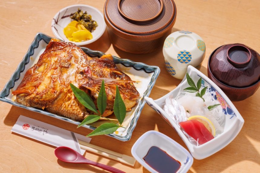 当店人気のタイのあら炊きと地魚の刺身がセットになった定食です。