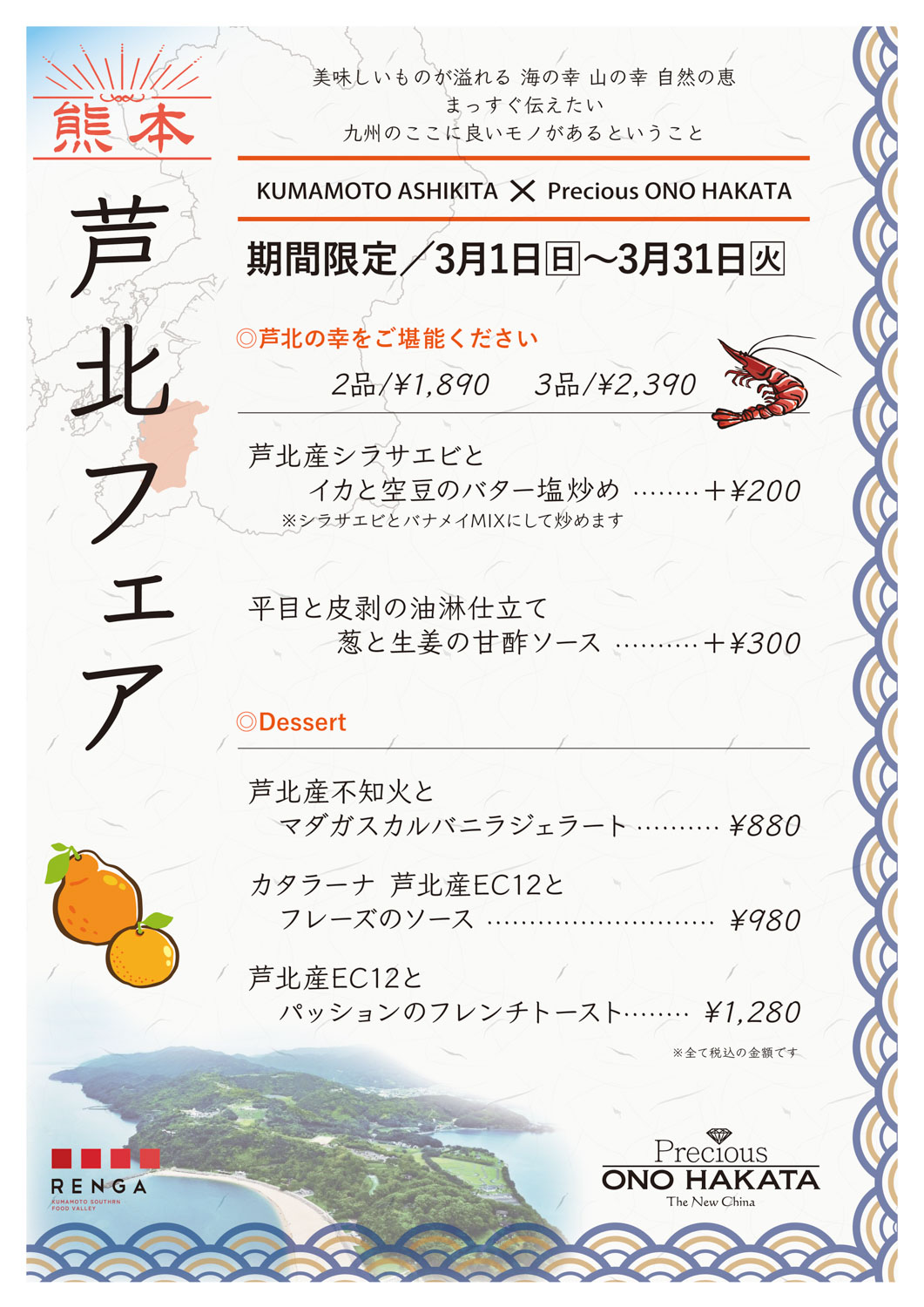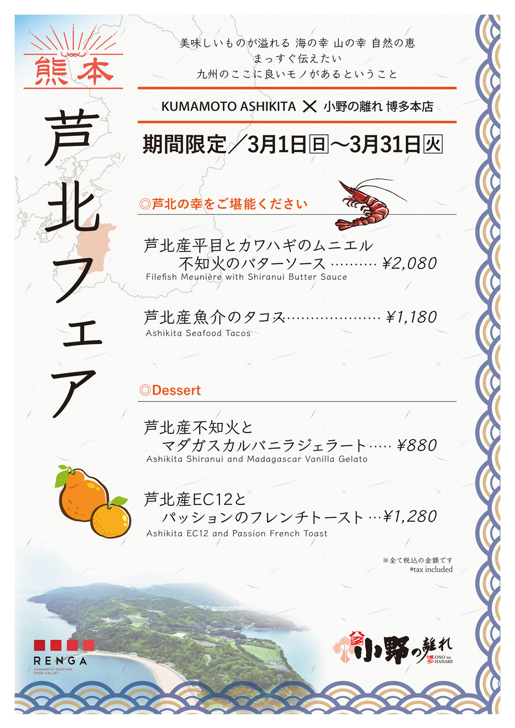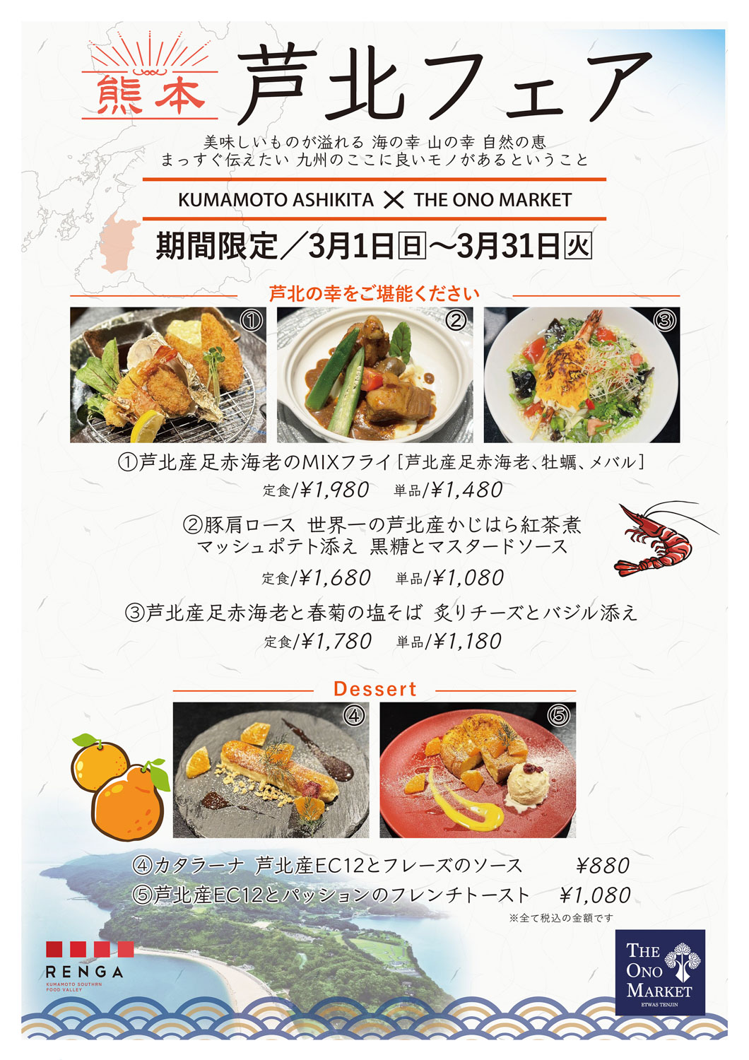 福岡市内をはじめとするONOグループのレストラン等6店舗において、「芦北フェア」が開催中です!