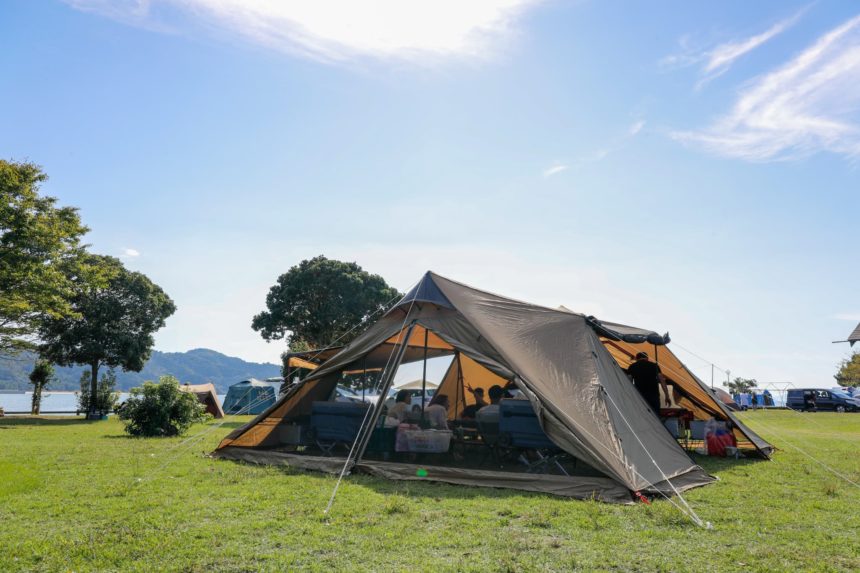「海の音」は、御立岬公園の海辺にあるキャンプ場で、”うみのおと”をBGMにキャンプを楽しめます。全7張の常設テントに泊まることも、持ち込みテントを張ることも可能で、本格的なキャンプが楽しめます。
